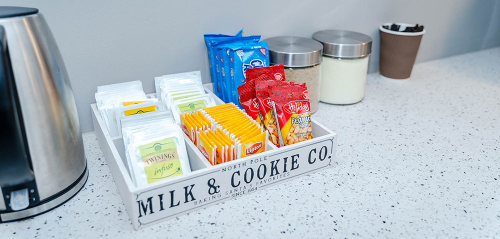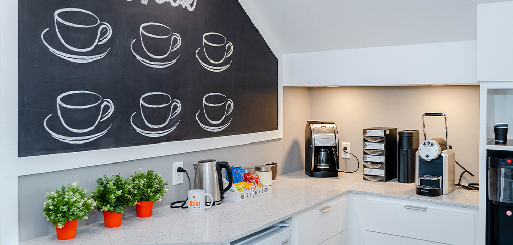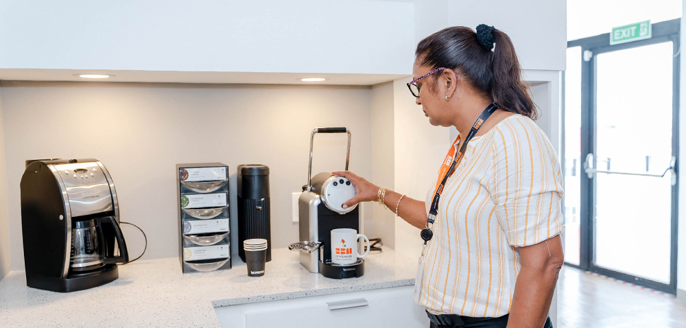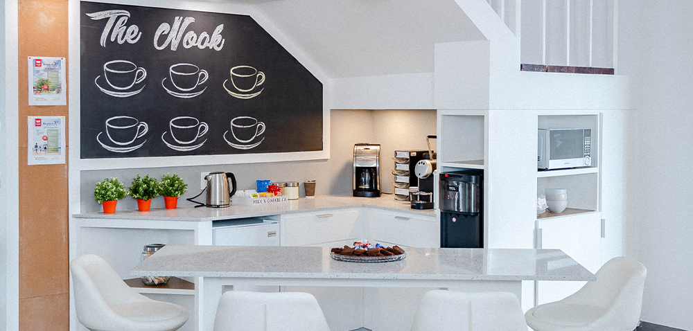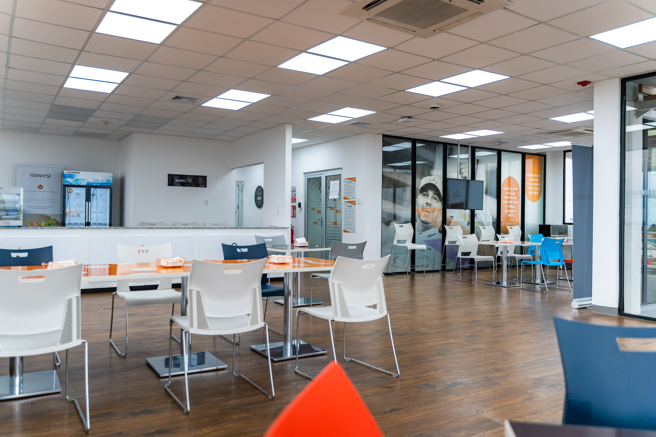 Amenities include a gym, cafeteria “The Lunch” for which catering is provided by New Rest, a kitchen on each floor as well as a cozy “Tea Nook” located on the second floor.